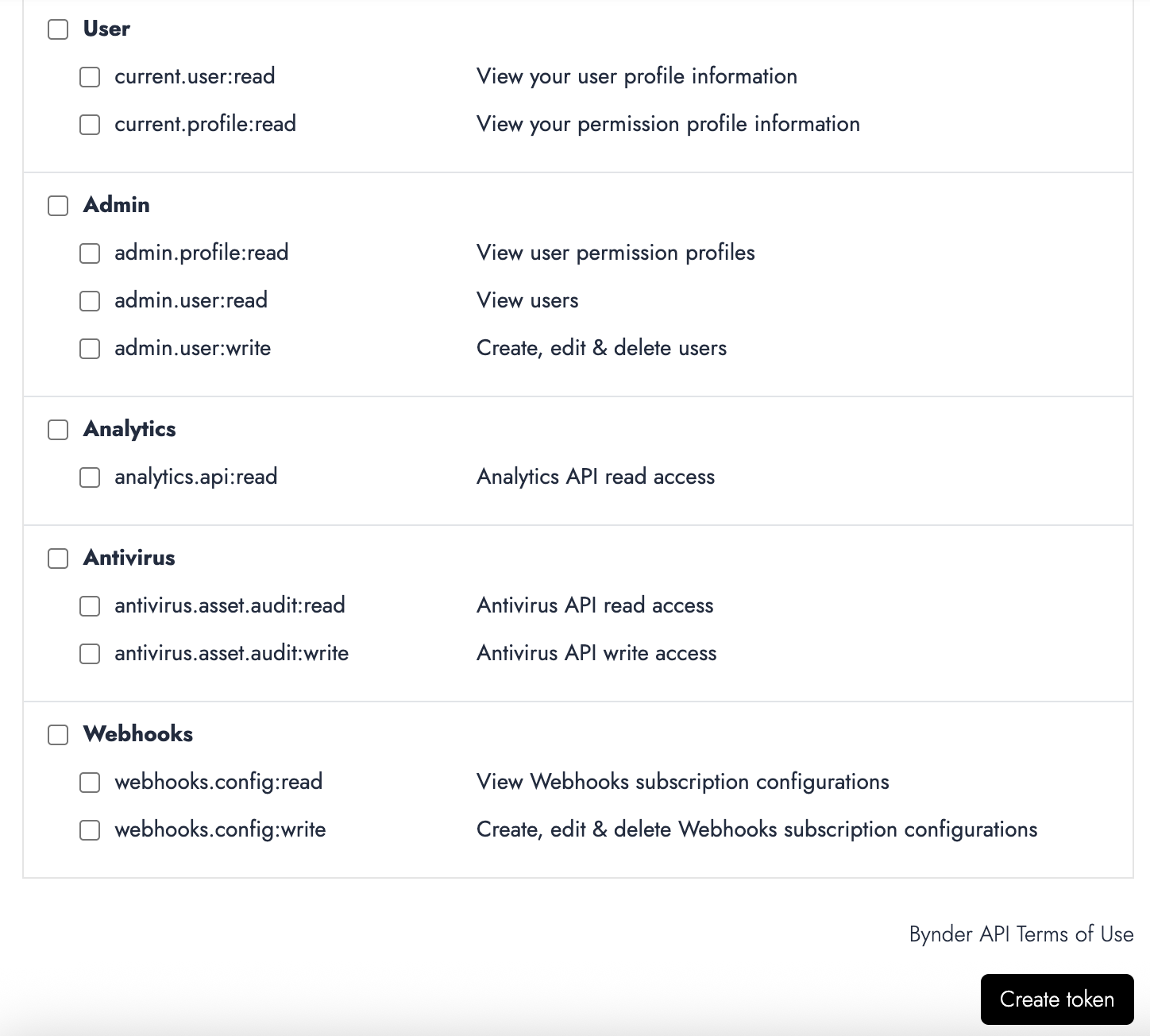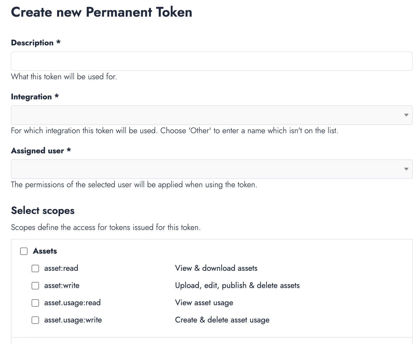 - Select the Bynder resources you want to access with this permanent token in the Scopes section.